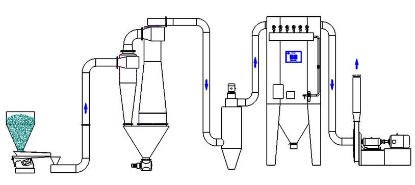 氣力輸送設(shè)備一般由受料器(如喉管、吸嘴、發(fā)送器等)、輸送管、風(fēng)管、分離器(常用的有容積式和旋風(fēng)式兩種)、鎖氣器(常用的有翻板式和回轉(zhuǎn)式兩種,既可作為喂料器,又可作為卸料器)、除塵器和風(fēng)機(jī)(如離心式風(fēng)機(jī)、羅茨鼓風(fēng)機(jī)、水環(huán)真空泵、空壓機(jī)等)等設(shè)備和部件組成。鄭州佑飛科技聯(lián)系電話:18503860105 QQ: 253791333 受料器的作用是進(jìn)人物料,造成合適的料氣比,使物料啟動(dòng)、加速。分離器的作用是將物料與空氣分離,并對物料進(jìn)行分選。鎖氣器的作用是均勻供料或卸料,同時(shí)阻止空氣漏人。風(fēng)機(jī)的作用是為系統(tǒng)提供動(dòng)力。真空吸送系統(tǒng)常用高壓離心風(fēng)機(jī)或水環(huán)真空泵;而壓送系統(tǒng)則需用羅茨鼓風(fēng)機(jī)或空壓機(jī)。